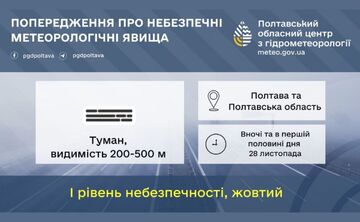 Полтавський обласний центр з гідрометеорології попереджає про небезпечне метеорологічне явище I рівня (жовтий).