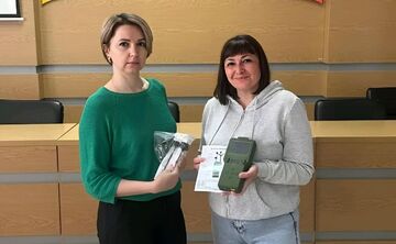 Секретар міської ради Тетяна Малиш передала пристрій дружині військовослужбовця Марині Бреус.