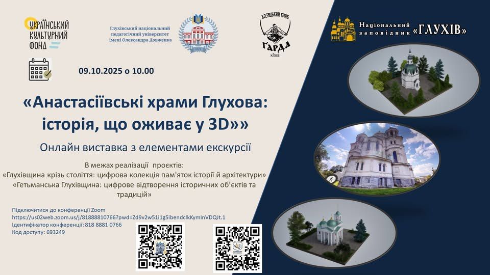 Учасники конференції мали змогу побачити у цифровому просторі глухівські храми та палац Розумовського, що посідають унікальне місце в історії культової архітектури України завдяки своїм високим мистецьким якостям та незвичайній історії будівництва, сповненій трагічних подій, до яких були причетні видатні українські політичні діячі та архітектори. Трьох-Анастасіївська церква у центрі Глухова є наймасивнішою домінантною спорудою міста і, безумовно, його окрасою. Палац гетьмана Розумовського — втрачена пам’ятка архітектури, одна з найвиразніших будівель у стилі європейського бароко на теренах Лівобережної України у XVIII ст. Зведення гетьманського палацу у м. Глухові пов’язане з іменем останнього гетьмана Лівобережної України — Кирила Григоровича Розумовського (1728–1803 рр.), який протягом 1750–1764 рр. перебував на чолі гетьманської адміністрації.