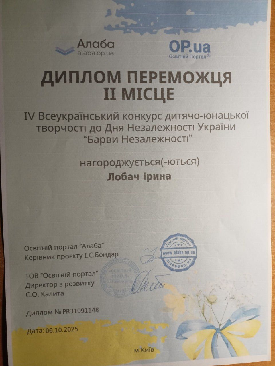 Учениця 9 класу Малобакайського ЗЗСО І-ІІІ ступенів Лобач Ірина виборола ІІ місце у конкурсі.