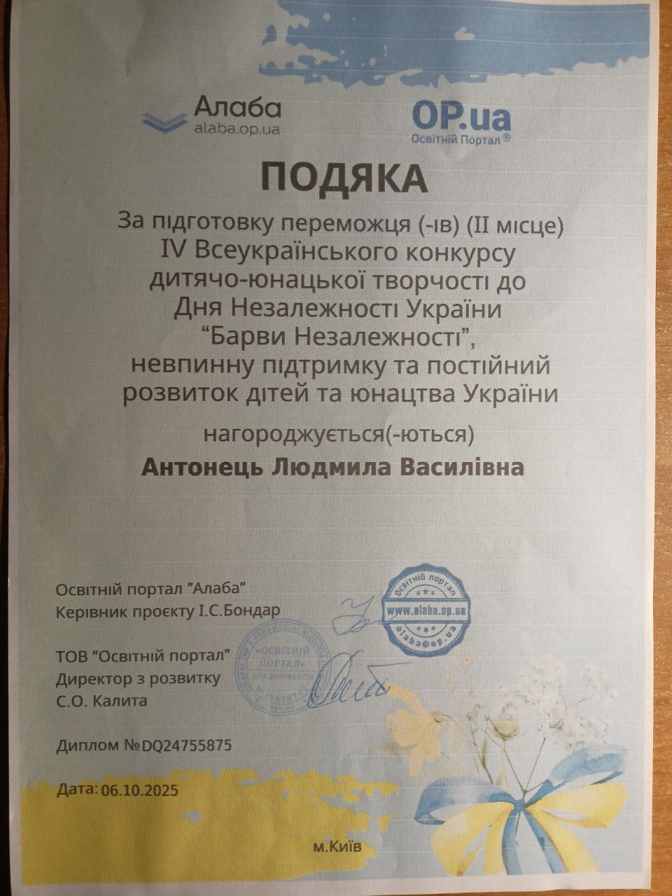 Подякою за підготовку переможниці у ІV Всеукраїнський конкурс дитячо-юнацької творчості до Дня Незалежності України «Барви Незалежності», невпинну підтримку та постійний розвиток дітей та юнацтва України нагороджено вчителя Антонець Людмилу Василівну.