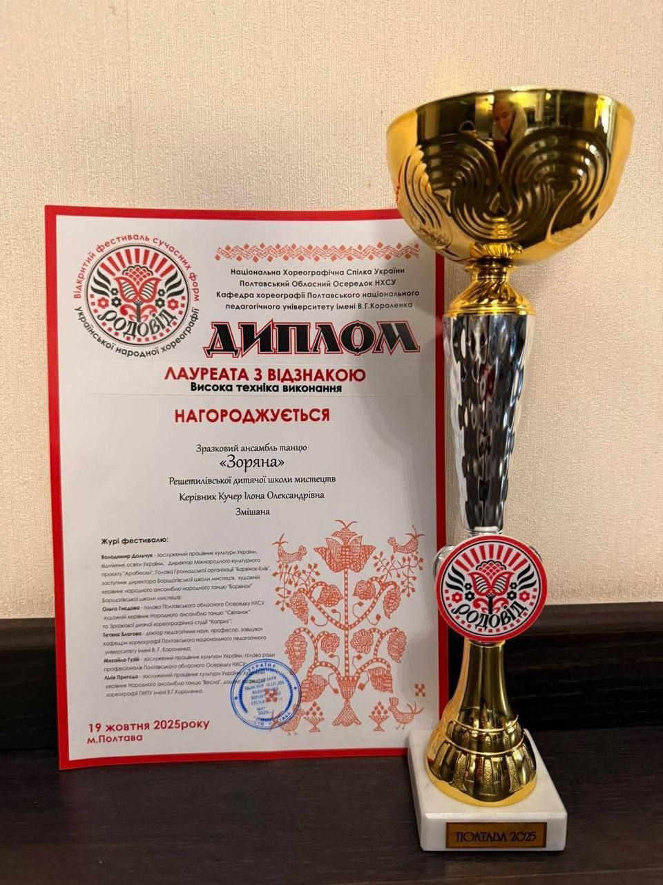 Решетилівку гідно представив Зразковий ансамбль танцю «Зоряна» дитячої школи мистецтв. Юні танцівники вразили журі своєю майстерністю, енергією та любов’ю до танцю, здобувши диплом лауреата з відзнакою за високу техніку виконання.