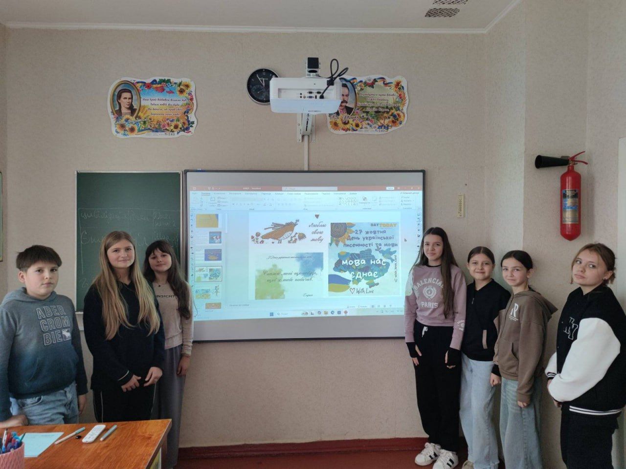 Семикласники працювали над цікавими завданнями на картках. Також вони здійснили віртуальну подорож в історію свята та мови, переглянувши пізнавальну презентацію.