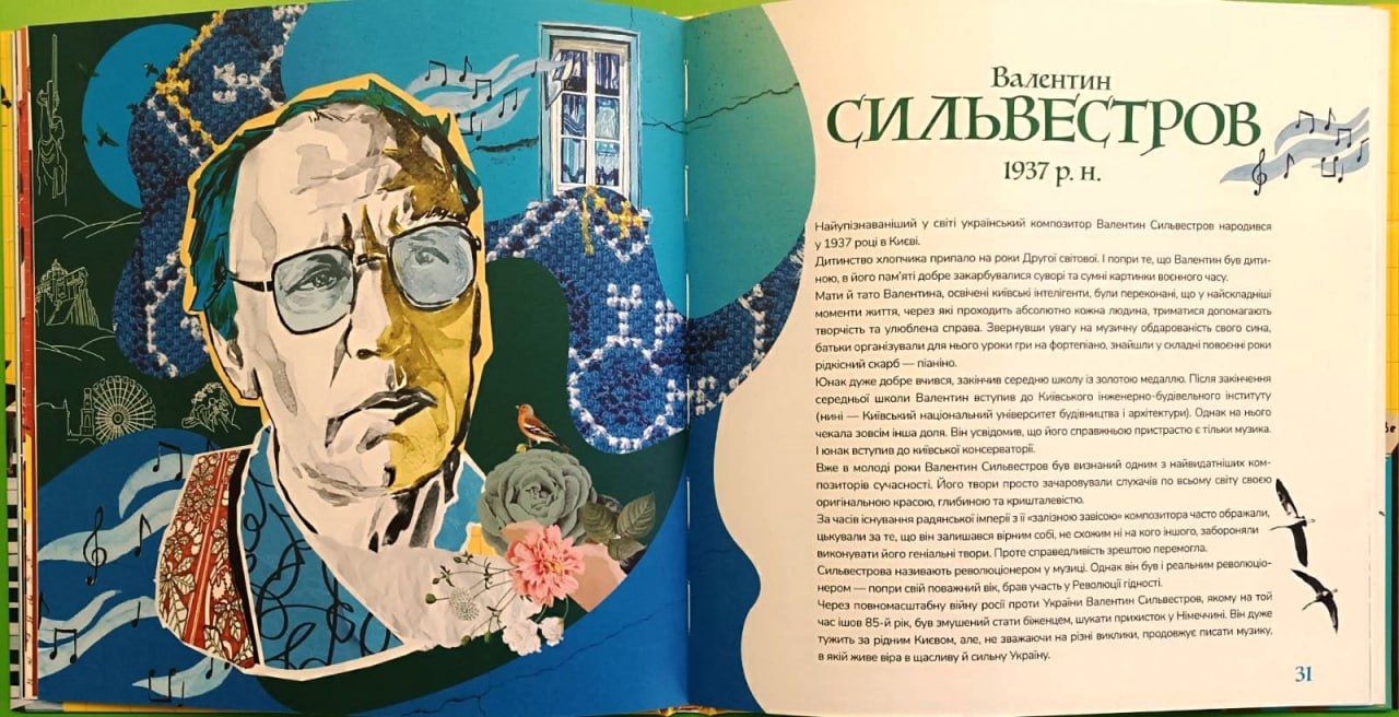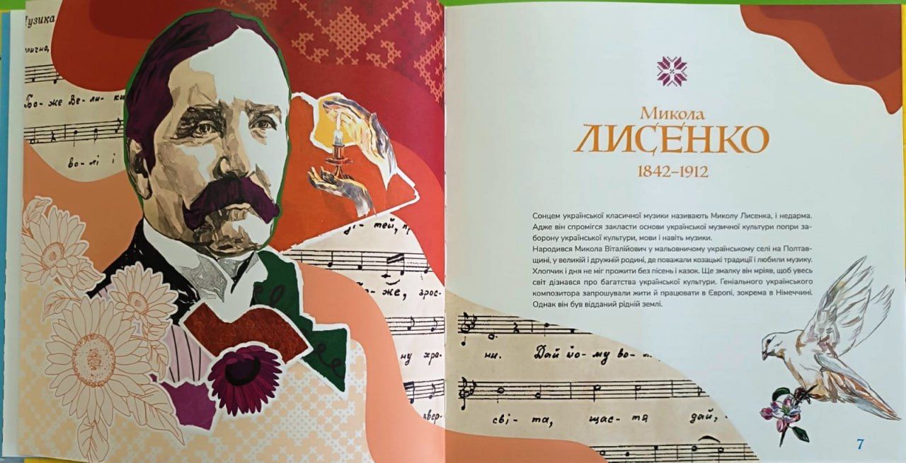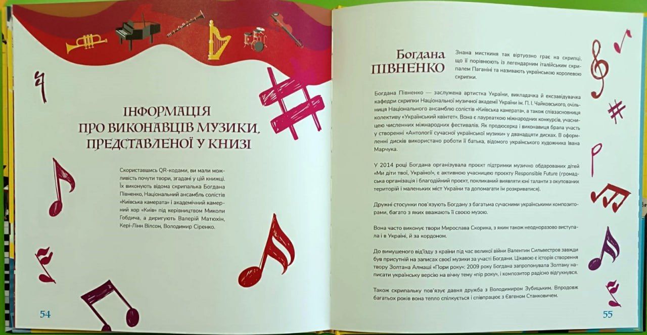 «А ще в книжці розповідається про творчі колективи (Муніципальний академічний камерний хор „Київ“, Національний ансамбль солістів „Київська камерата“) та виконавців музичних творів, які можна прослухати за QR-кодами (Богдану Півненко, Володимира Сіренка, Кері-Лінн Вілсон). Хоча книга призначена для дітей молодшого та середнього віку, та вона буде корисною і більш старшим читачам. Музика здатна говорити різними мовами світу і українці різних поколінь, знаючи більше про вітчизняну класичну музику, будуть сильнішими, певними своєї гідності, здатними опиратися ворогові та відстоювати інтереси України», — йдеться у повідомленні.