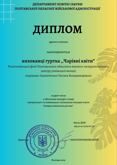 «Ця нагорода засвідчує високий рівень екологічної культури, практичних навичок озеленення та естетичного оформлення, які формуються у вихованців. Ваша робота є важливим внеском у створення здорового, естетичного та екологічно свідомого середовища. Нехай кожен ваш паросток перетвориться на нову перемогу!», — підсумували успіхи юних натуралістів у Решетилівській філії ПОЕНЦУМ.