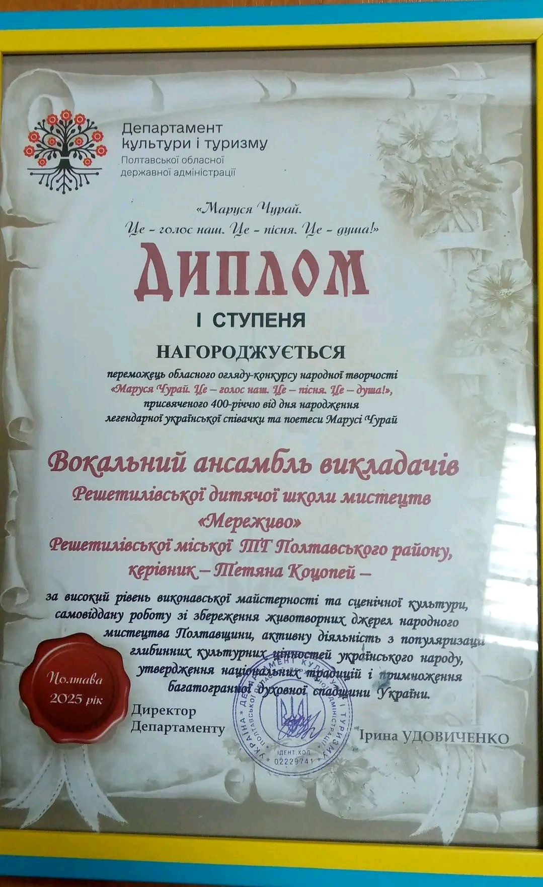 Вокальний колектив «Мереживо» Решетилівської ДШМ отримав перемогу у конкурсі «Маруся Чурай. Це — голос наш. Це — пісня. Це — душа».