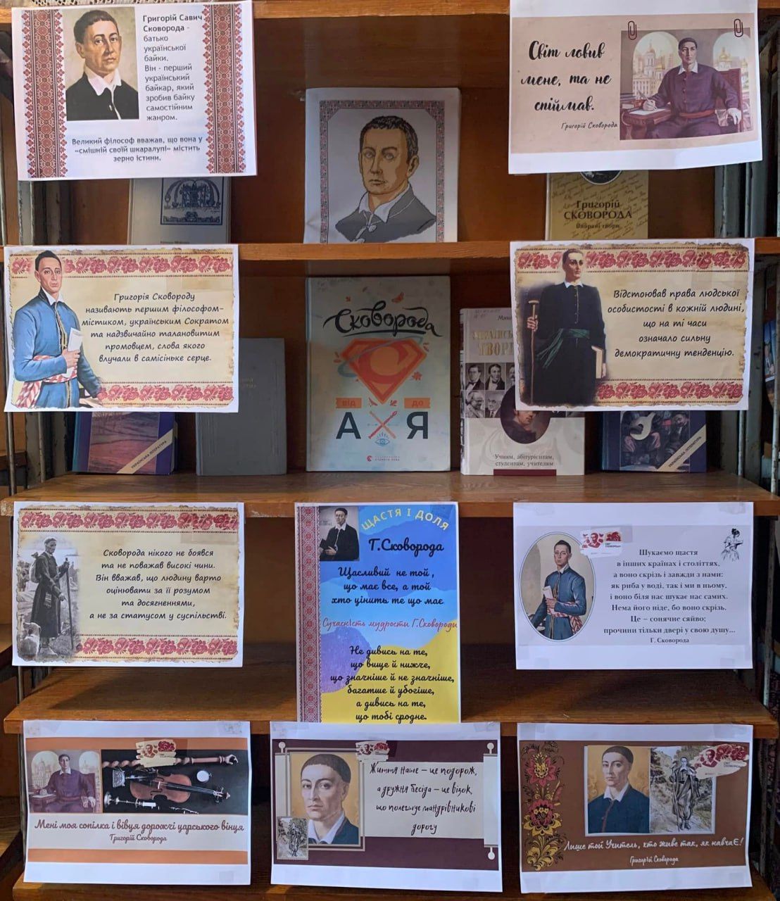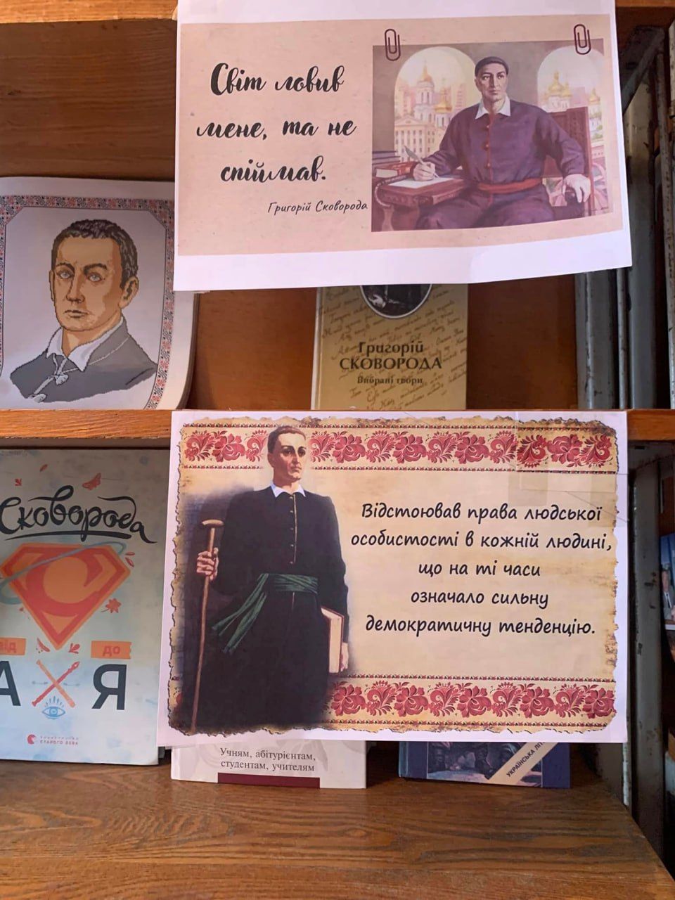 «Григорій Сковорода — автор безлічі цитат про щастя, дружбу, правду, працю та самопізнання. Серед них відомі такі вислови: „Не бійся вмерти тілесно, бо будеш кожної хвилини терпіти смерть духовну“, „Шукаємо щастя по сторонах, по віках, по станах. А воно скрізь і завжди з нами“, „Ніяким чином не можна пізнати Господа, не пізнавши самого себе“ та „Краще бути природнім котом, ніж левом з ослячою природою“. Запрошуємо користувачів до нашої бібліотеки для ознайомлення з книжковою виставкою — портретом!», — зазначає бібліотекар Людмила Гавриленко.
