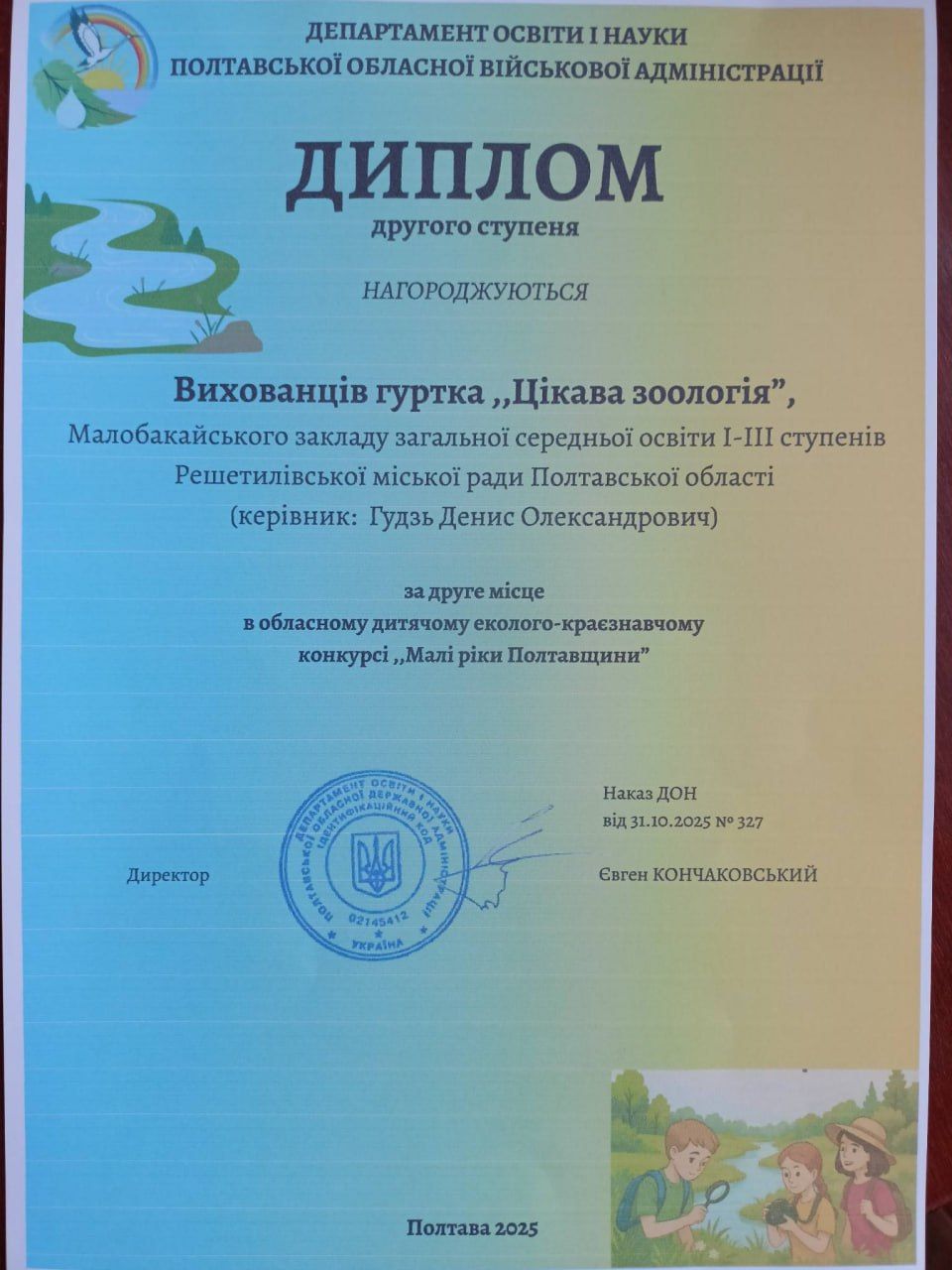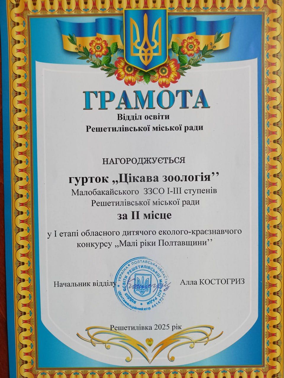 Вихованки гуртка «Цікава зоологія» — учениця 6 класу Ворона Вікторія та учениця 7 класу Арендаренко Анна посіли ІІ місце у І (міському) етапі обласного дитячого еколого-краєзнавчого конкурсу «Малі ріки Полтавщини».