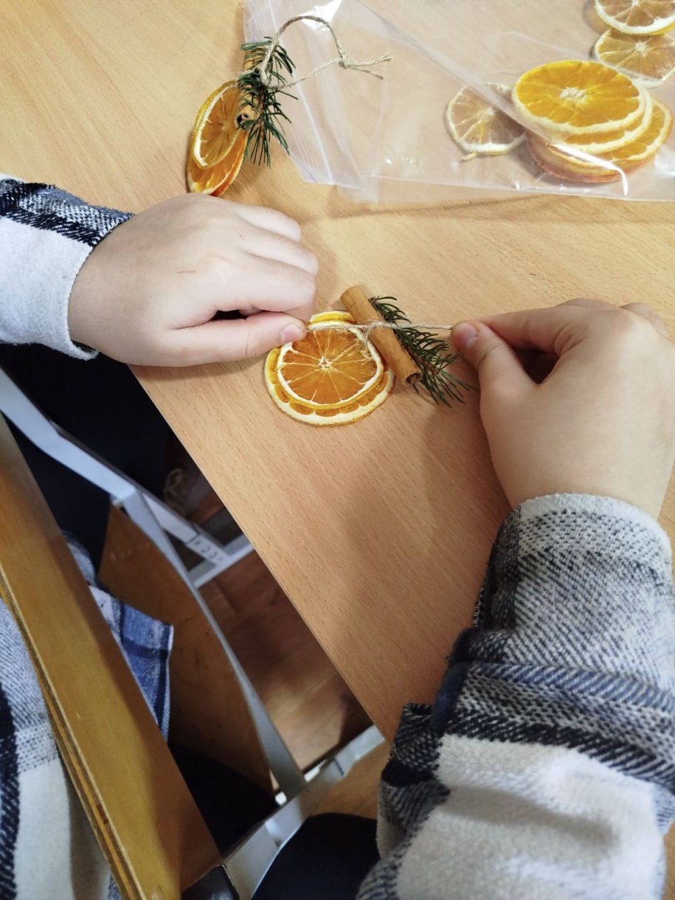 Вихованці гуртка створили зимову святкову іграшку з сушених цитрусів та кориці, поєднуючи природні матеріали у гармонійні композиції.