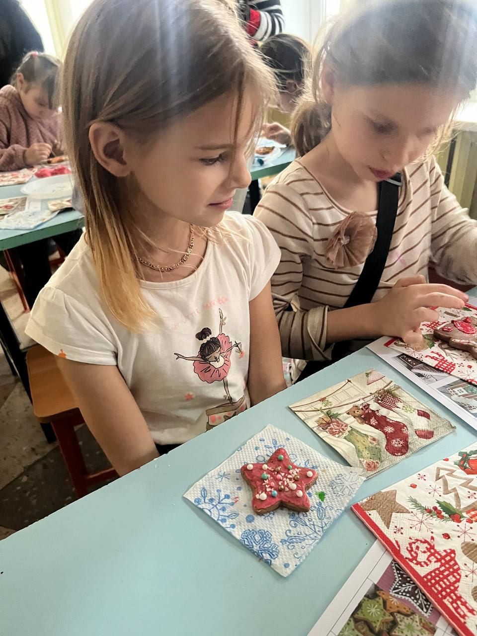Далі всі поринули у кулінарно-мистецьку частину заняття: діти вперше побачили й понюхали ароматні спеції, з яких народжується смак імбирного пряника — корицю, імбир, кардамон, гвоздику. Приготували кольоровий айсінг, змішуючи барви так, ніби малювали зимову палітру.