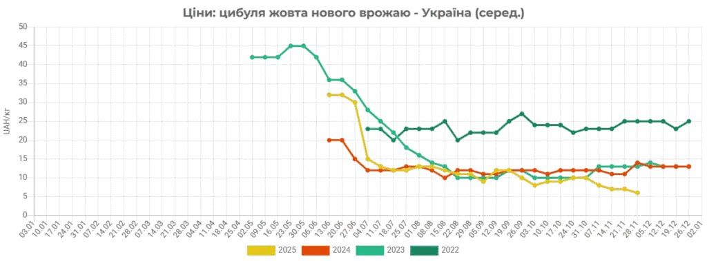 Варто зазначити, що на сьогоднішній день цибуля в Україні вже реалізується в середньому на 68% дешевше, ніж на початку грудня 2024 року