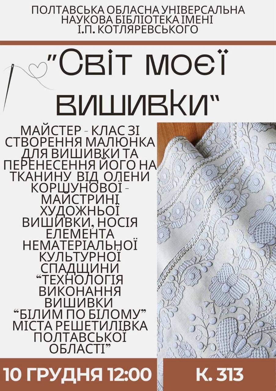 Уже цієї середи, 10 грудня, наша землячка, майстриня художньої вишивки, членкиня НСМНМУ, носій елементу нематеріальної культурної спадщини «Технологія виконання вишивки „білим по білому“ міста Решетилівка Полтавської області» Олена Коршунова проведе у Полтаві майстерклас.