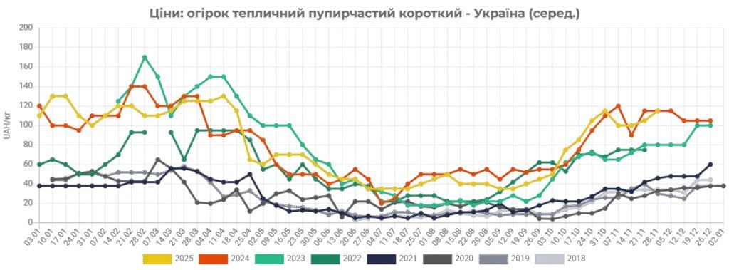 «На сьогоднішній день оптові ціни на тепличні огірки в Україні продовжують поступово зростати, і вже озвучуються в діапазоні 100-130 грн/кг ($2,37-3,08/кг), залежно від якості, сорту та обсягів партій продукції, що пропонуються, що в середньому на 10% дорожче, ніж тижнем раніше. І вже можна з упевненістю заявити, що нинішні ціни на ці тепличні овочі стали найвищими як мінімум за останні 8 років!», — йдеться у повідомленні.