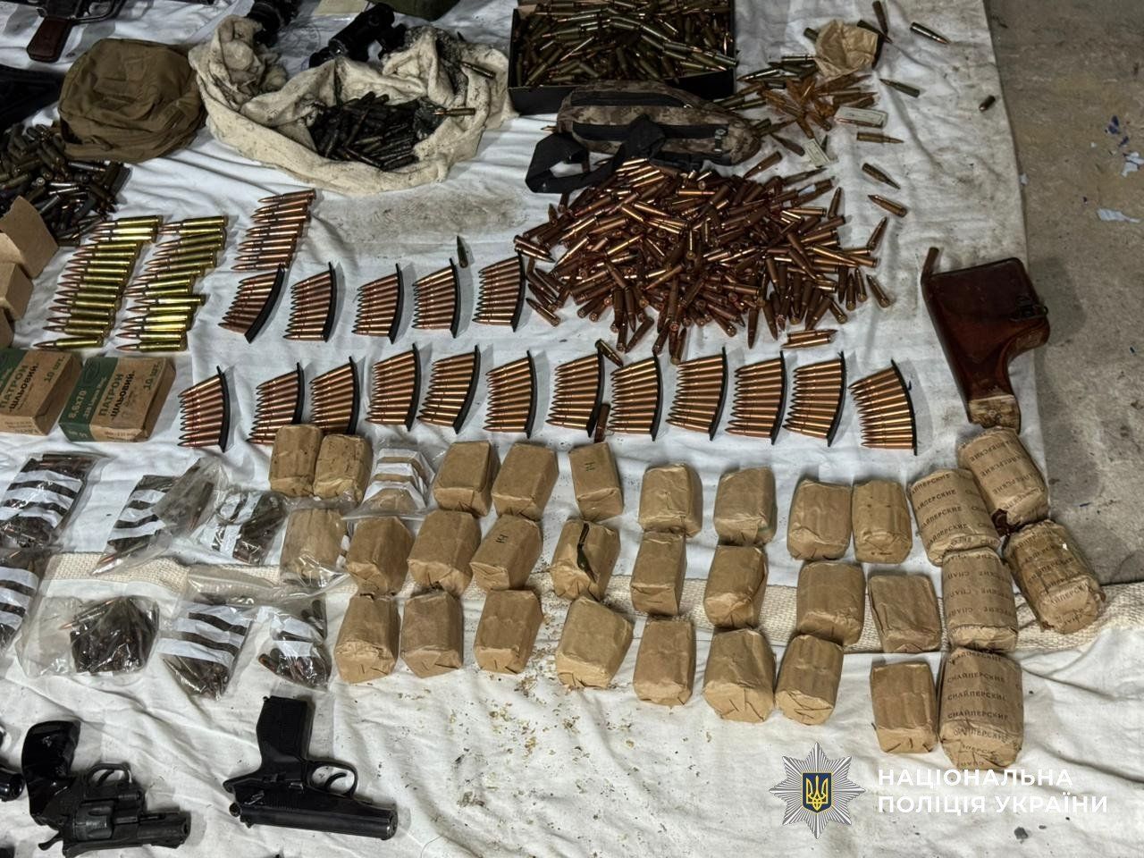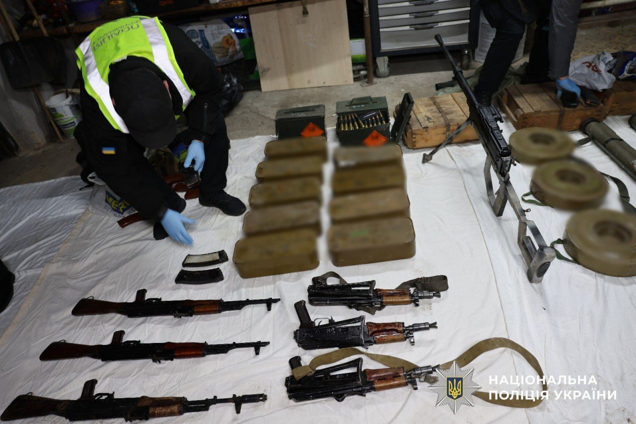 Під час обшуків правоохоронці виявили схрон зброї: 48 автоматів Калашникова, 26 пістолетів Макарова, 4 кулемети, 8 одиниць іншої нарізної вогнепальної зброї, 4 гранатомети та 31 постріл до гранатометів, 8 мін, 76 гранат, майже 26 000 набоїв різного калібру, запали, підривачі, детонатори, майже 21 кілограм вибухівки, глушники, димові шашки, багнет-ножі, споряджені магазини.