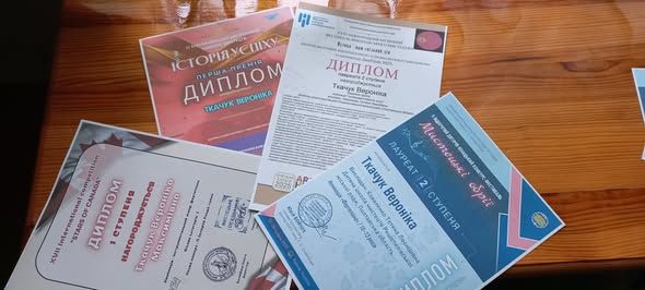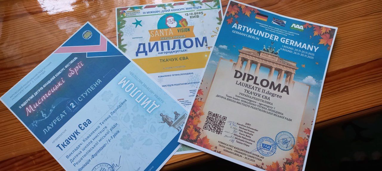 Зокрема, Єва Ткачук отримала два дипломи І ступеня на міжнародних конкурсах: «Hello, Switzerland» та «Santa Vision». Також завоювала дипломи ІІ ступеня на конкурсі «Artwunder Germany». Успішним був і дебют дівчини на ІІ Відкритому дитячо-юнацькому конкурсі-фестивалі «Мистецькі обрії 2025» (м. Харків), де Єва отримала почесне 2 місце.