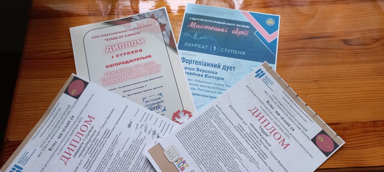 Фортепіанний дует — Вікторія Соловйова та Вероніка Ткачук також назбирали цілу колекцію нагород. Зокрема, на XVII International completition «Stars of Canada» та ХІ Міжнародному конкурсі мистецтв «Hello, Switzerland» — І місце. Також І місце талановиті дівчата зайняли і на IV Відкритому конкурсі естрадно-джазового виконання та імпровізації «JazzFiesta 2025» та ІІ Відкритому дитячо-юнацькому конкурсі-фестивалі «Мистецькі обрії».