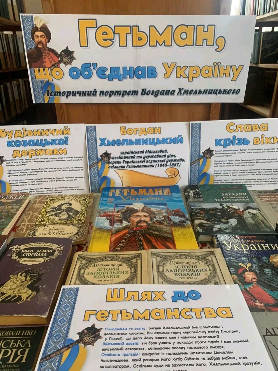 У Решетилівській ЦМБ ім. О.М. Дмитренка підготували виставку-хроніку «Гетьман Війська Запорозького». Під час візиту до книгозбірні, відвідувачі зможуть побачити хронологію ключових битв та політичних рішень Хмельницького, відчути атмосферу XVII століття та поміркувати над тим, як уроки минулого відгукуються в нашому сьогоденні.