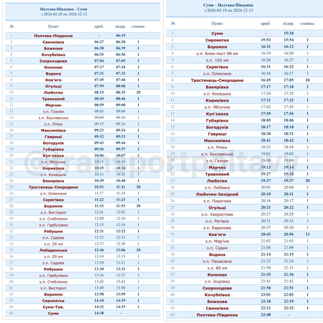 Як пояснили залізничники, зміни до розкладу внесли з міркувань безпеки. Тепер поїзд вирушає із Сум о 15:36 та прибуває на станцію Полтава-Південна о 22:48, прямуючи визначеним маршрутом.