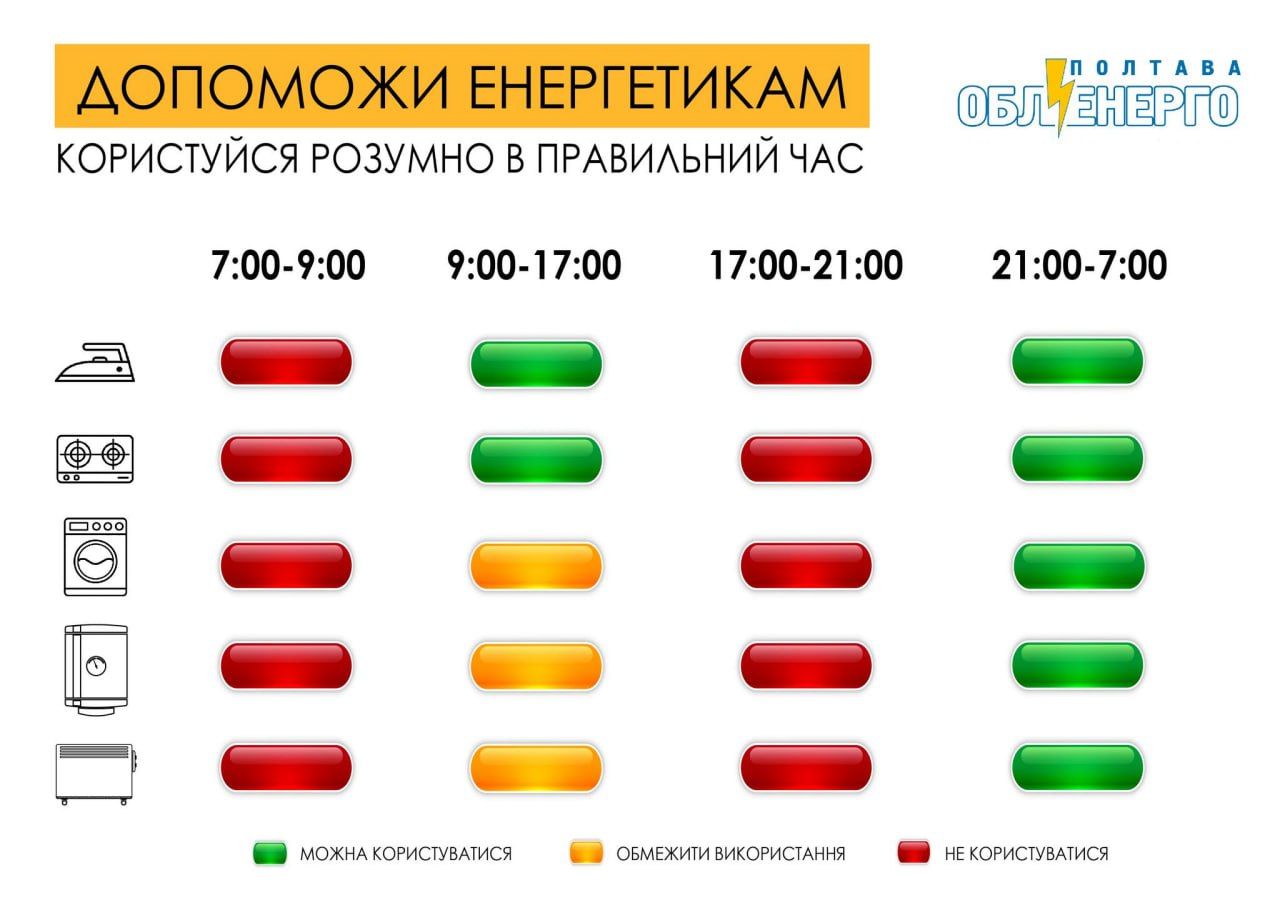 «Є два періоди пікового споживання: вранці з 7:00 до 9:00, коли всі збираються на роботу та ввечері з 17:00 до 21:00, коли повертаються додому. Тому енергетики вкотре нагадують, що в ці часові проміжки слід обмежити використання потужних приладів, тобто з 17:00 до 21:00 не вмикайте одночасно електрочайник, мікрохвильову піч, електроплиту та пральну машину, працюючи разом, вони перенавантажують електромережу. Потужні прилади, такі як пральна та посудомийна машини, краще вмикайте після 21:00. Цим ви допоможете зберегти баланс в енергосистемі, а також дозволите стабільно працювати обладнанню без перевантажень!», — зазначають у АТ «Полтаваобленерго».