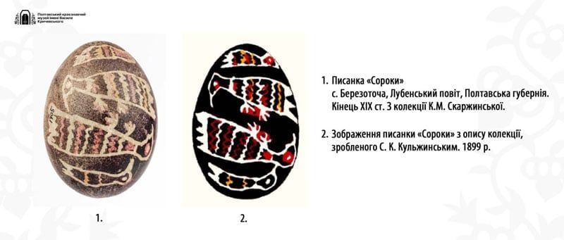 Про давню традицію писанкарства регіону свідчать також унікальні орнаменти: як ось ця незвичайна писанка з сороками, що зберігається у Полтаві. У музеї вважають, що вона пов’язана із культом предків.
