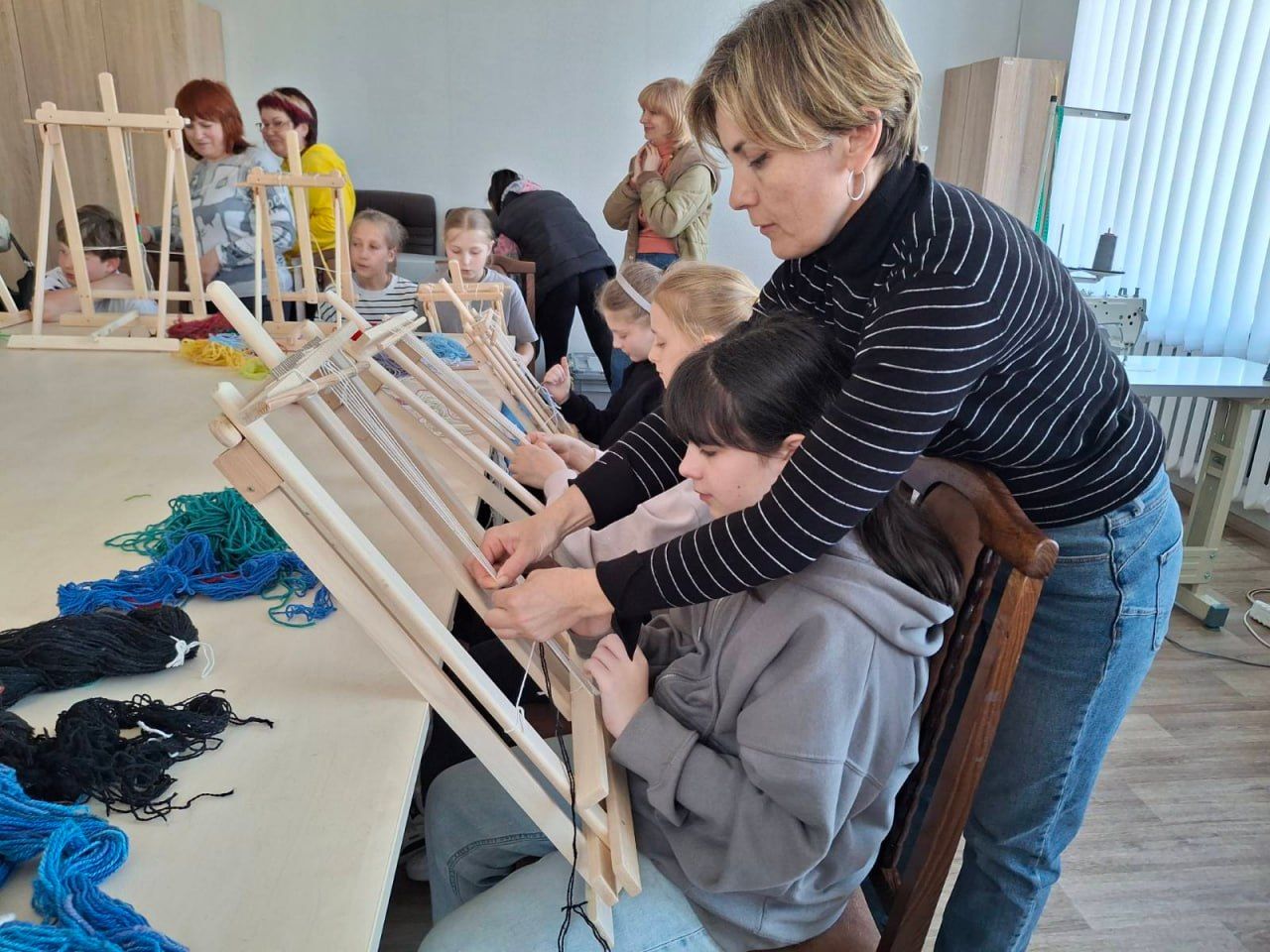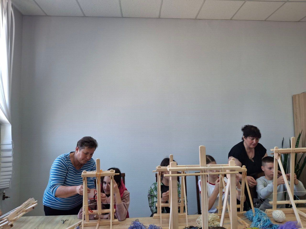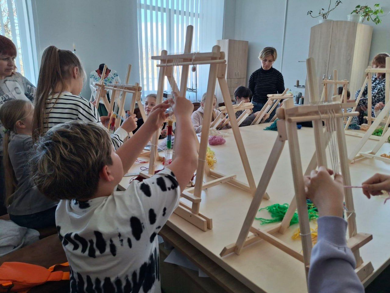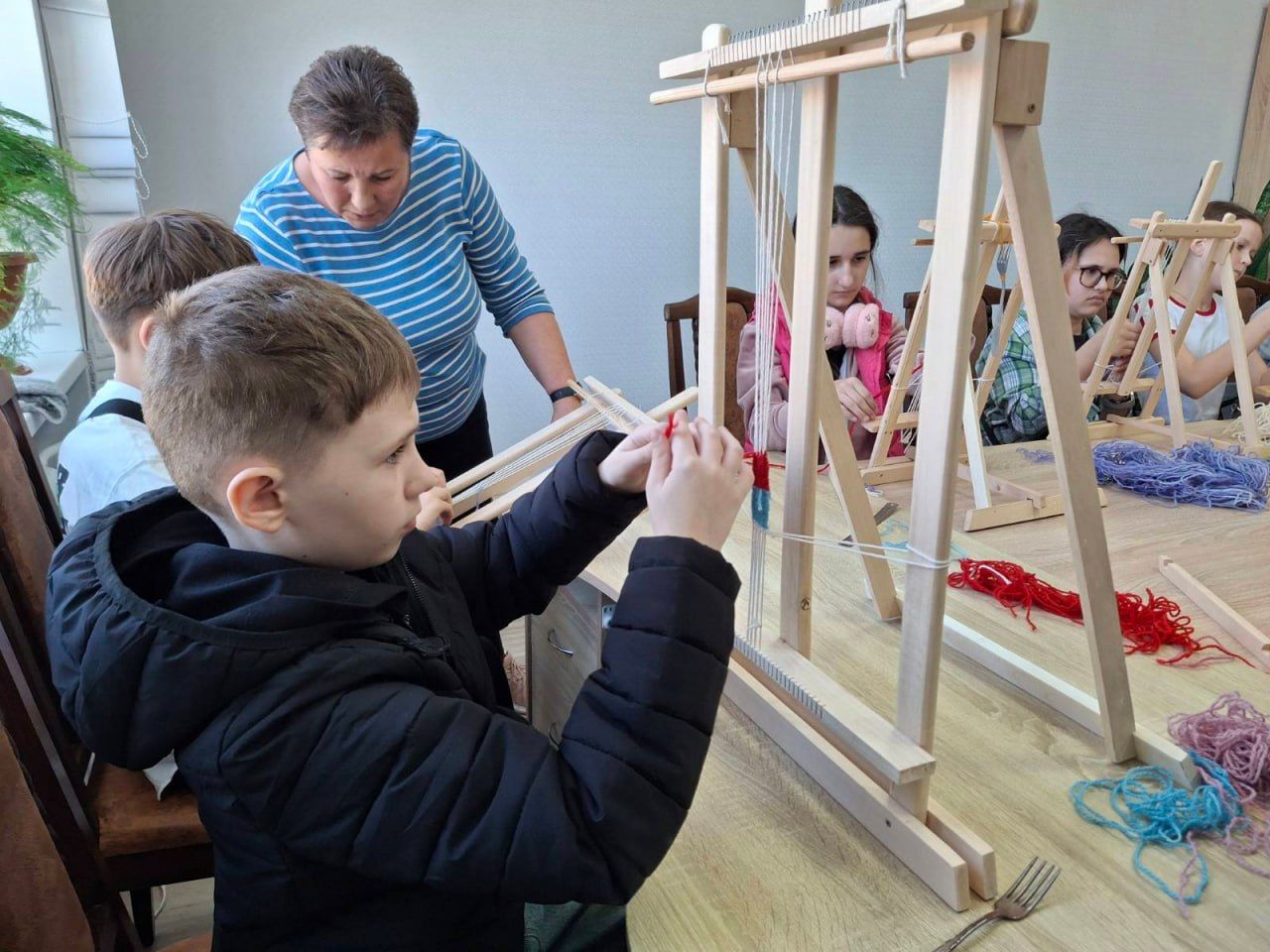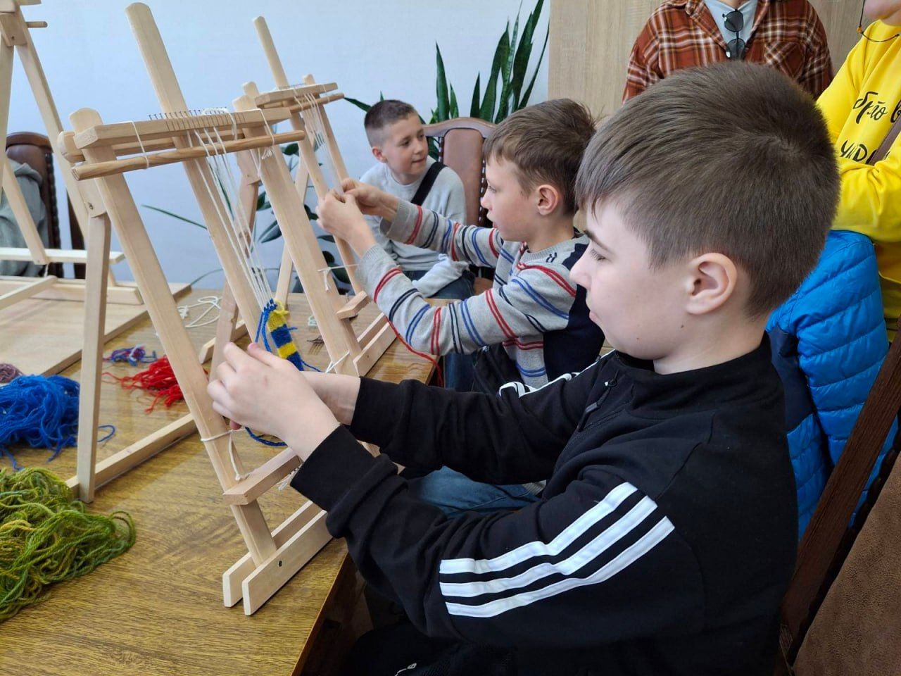 Також для п’ятикласників влаштували майстерклас з килимарства, від якого юні гості були в захваті. Вони дуже швидко опанували елементарні навички ткання. І за короткий час виготовили для себе фенічки. Варто сказати, що хлопчики і дівчатка з ентузіазмом вплітали барвисті вовняні ниточки між основою, зізнаючись, що їм дуже сподобалося займатися таким ремеслом.