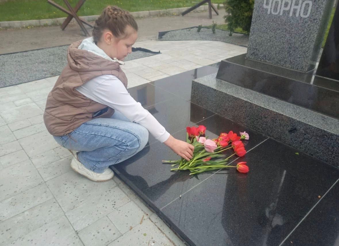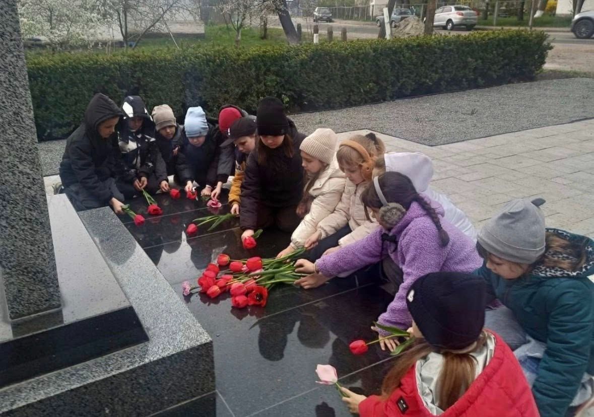 Школярі, разом із вихователем Світланою Семеновою, поклали квіти до підніжжя пам’ятника ліквідаторам аварії на Чорнобильській атомній станції та вшанували їхній подвиг.